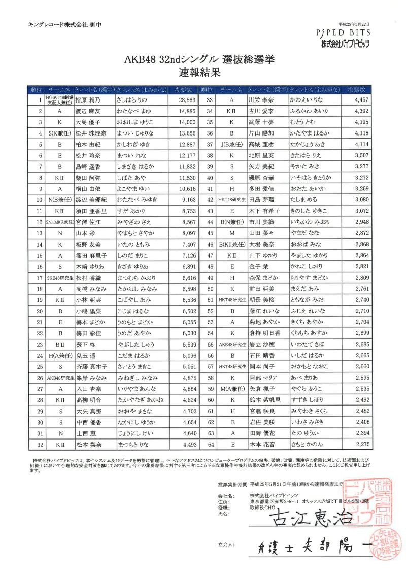 本日のAKB48劇場公演にて「AKB48 32ndシングル 選抜総選挙」の速報(1位~64位)を発表させていただきました。