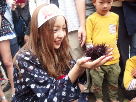 取れたてのウニを見て嬉しそうな板野