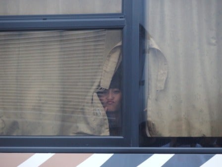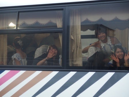 移動のバスから顔を出す島田