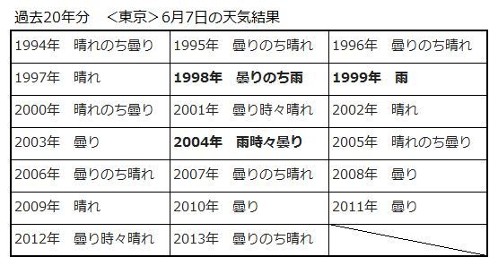 気になるお天気ですが、過去20年間 の天気結果を調べましたところ