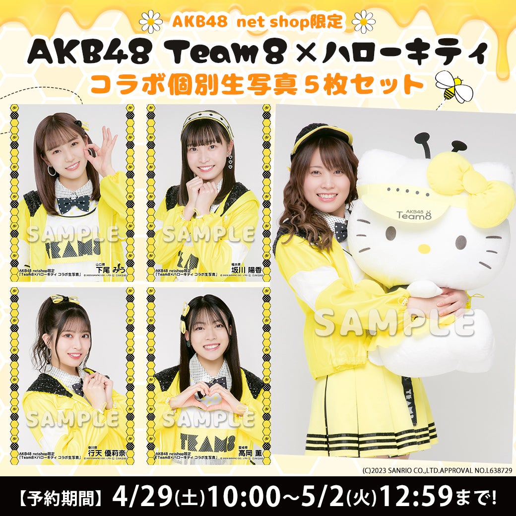 昨年大好評だったハローキティコラボをTeam8全メンバーの個別生写真として、特別にTeam8仕様のキティちゃんとのカットも封入しております!
