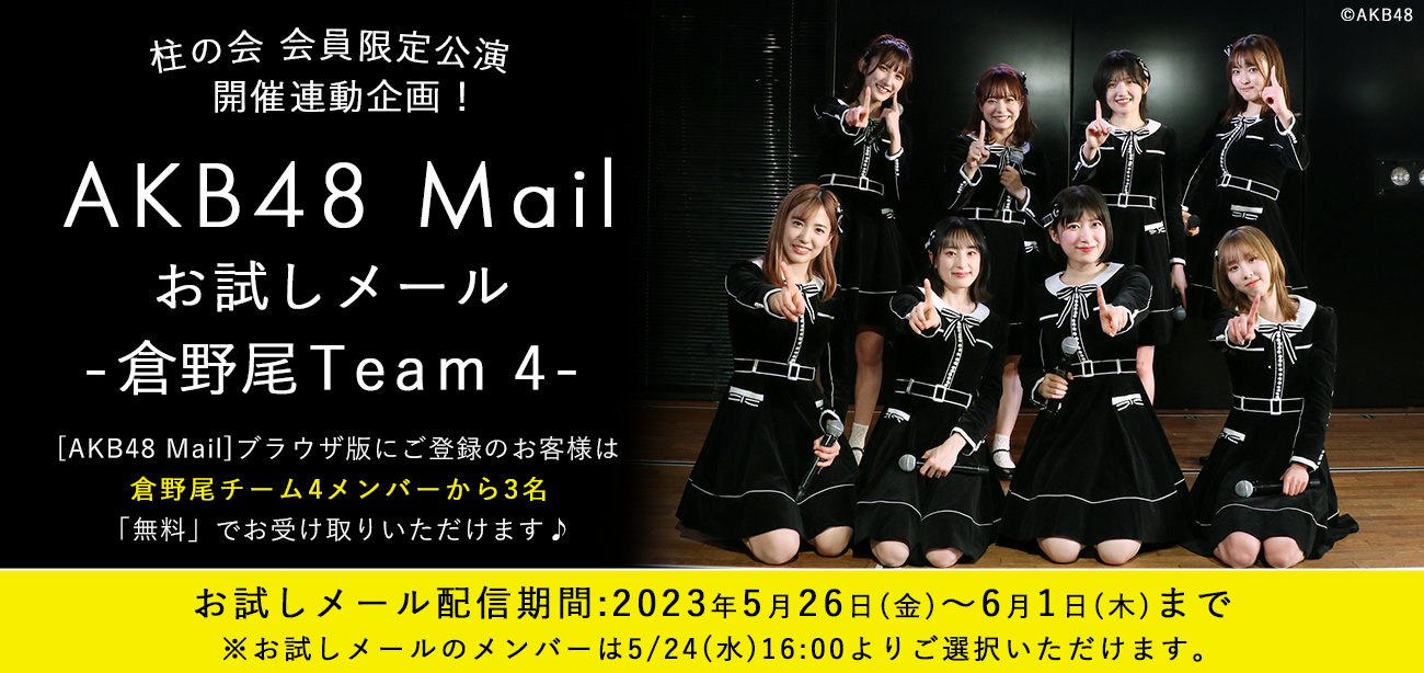 5月26日(金)9時より、AKB48 Mail(ブラウザ版)にて、倉野尾Team 4メンバーのお試しメールサービスをご提供いたします!