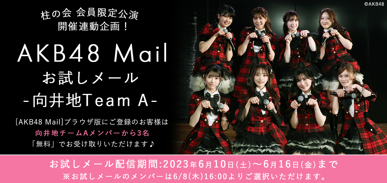 6月10日(土)9時より、AKB48 Mail(ブラウザ版)にて、向井地Team Aメンバーのお試しメールサービスをご提供いたします!