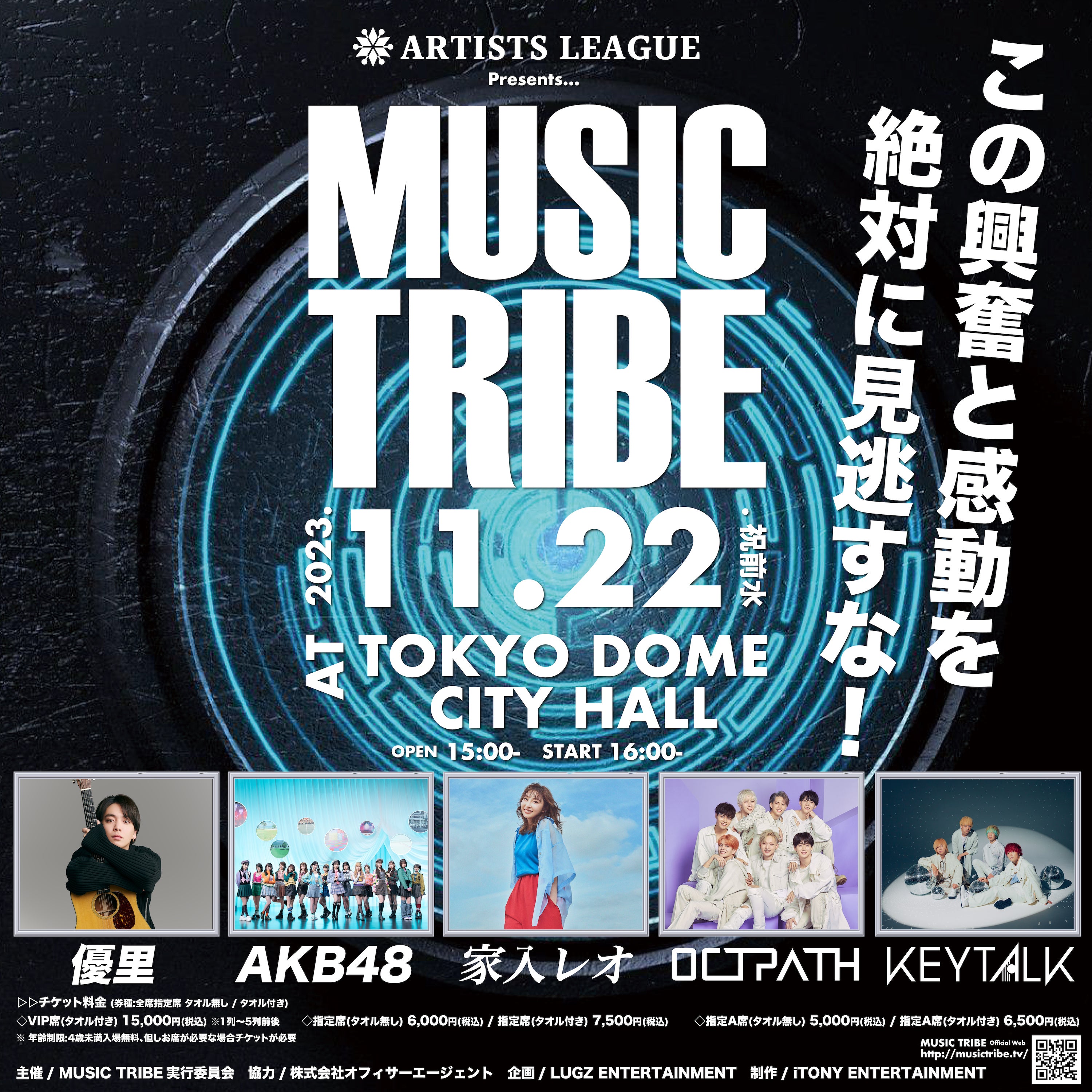 AKB48がアイドルステージのスペシャルアーティストを務める「ARTISTS LEAGUE 2023」を勝ち抜いた優勝者、各グループステージ一位通過アーティストと、各ステージスペシャルアーティストが一同に集う夢の音楽フェス『ARTISTS LEAGUE presents… MUSIC TRIBE』!