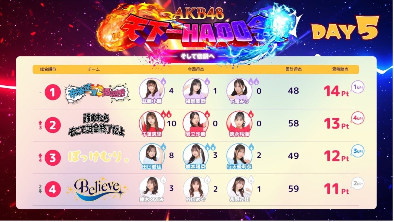 大盛真歩・田口愛佳・布袋百椛・山内瑞葵がキャプテンとなり、ドラフトを行ったチーム編成で挑む「AKB48天下一HADO会 そして伝説へ」!!