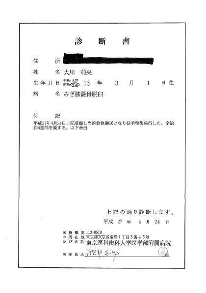 本日診断書が届き、「みぎ膝蓋骨脱臼」と診断されました。