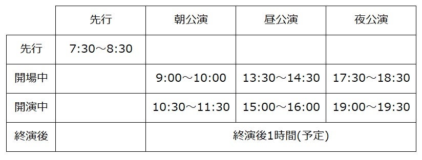 ※1:②⑤⑧開場中販売は、会場内での販売につき該当公演のチケットをお持ちの方のみ商品をご購入いただけます。(②朝公演チケット/⑤昼公演チケット/⑧夜公演チケット)