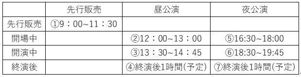 ※②⑤の開場中販売は、会場内での販売につき、該当公演のチケットをお持ちの方のみ商品をご購入いただけます。