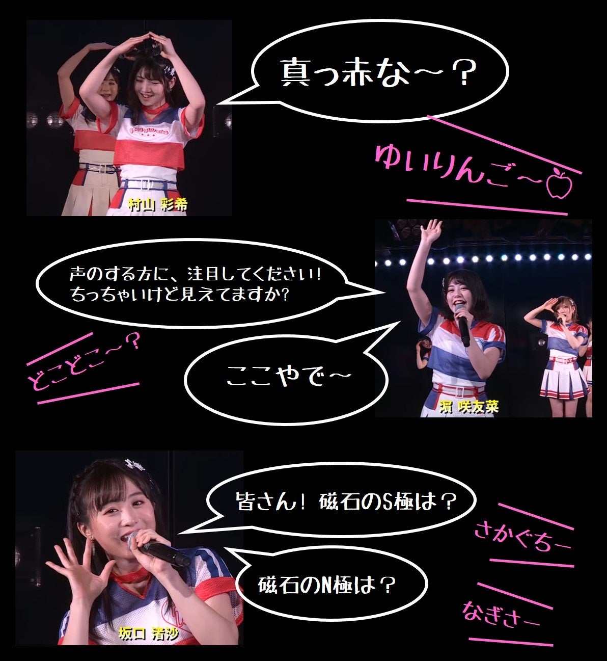 「真っ赤な―?」といえば「ゆいりんご」、「磁石のS極は?」といえば「さかぐちー」など「山と言えば川」のようにお決まりの返しがあります。