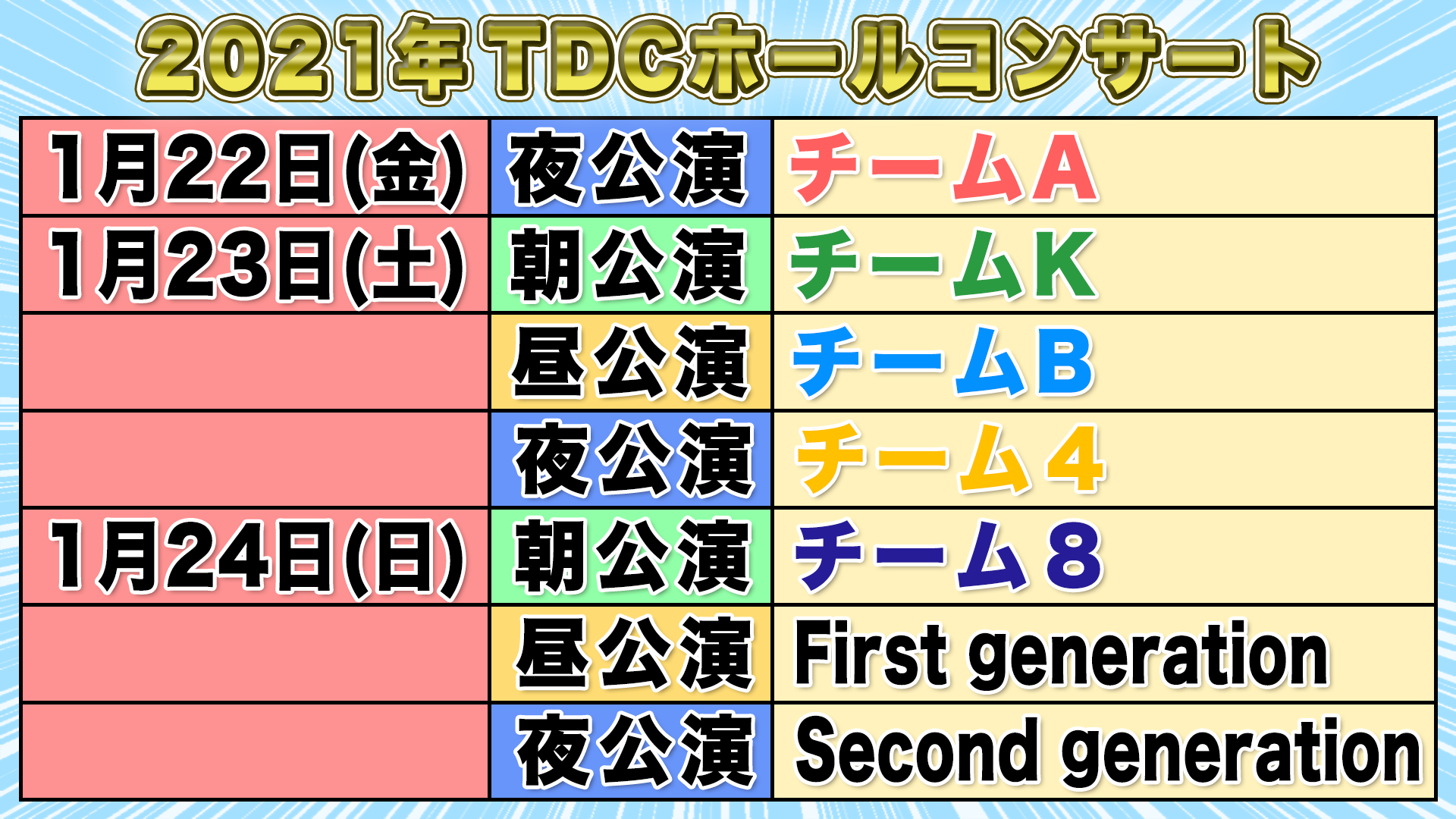 また最終日1月24日(日)の公演では加入期で分けたFirst generation(1期〜15期)とSecond generation(チーム8、ドラフト生、16期生)に分かれて楽曲を披露いたします。