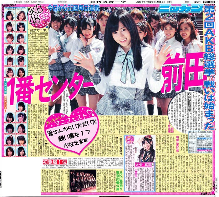 17thシングル選抜総選挙の政見放送のスタートと同時に、13日付けの日刊スポーツ朝刊から、AKB48、SKE48の選挙立候補者108人のマニフェスト連載の掲載をスタートしました。