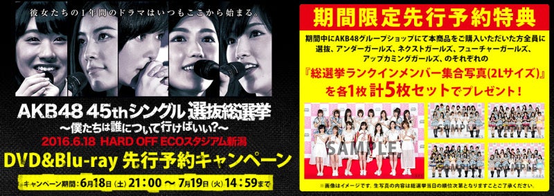 6月18日にHARD OFF ECOスタジアム新潟にて行われた「AKB48 45thシングル 選抜総選挙~僕たちは誰について行けばいい?~」DVD&Blu-rayのAKB48グループショップ先行予約が開始されました!