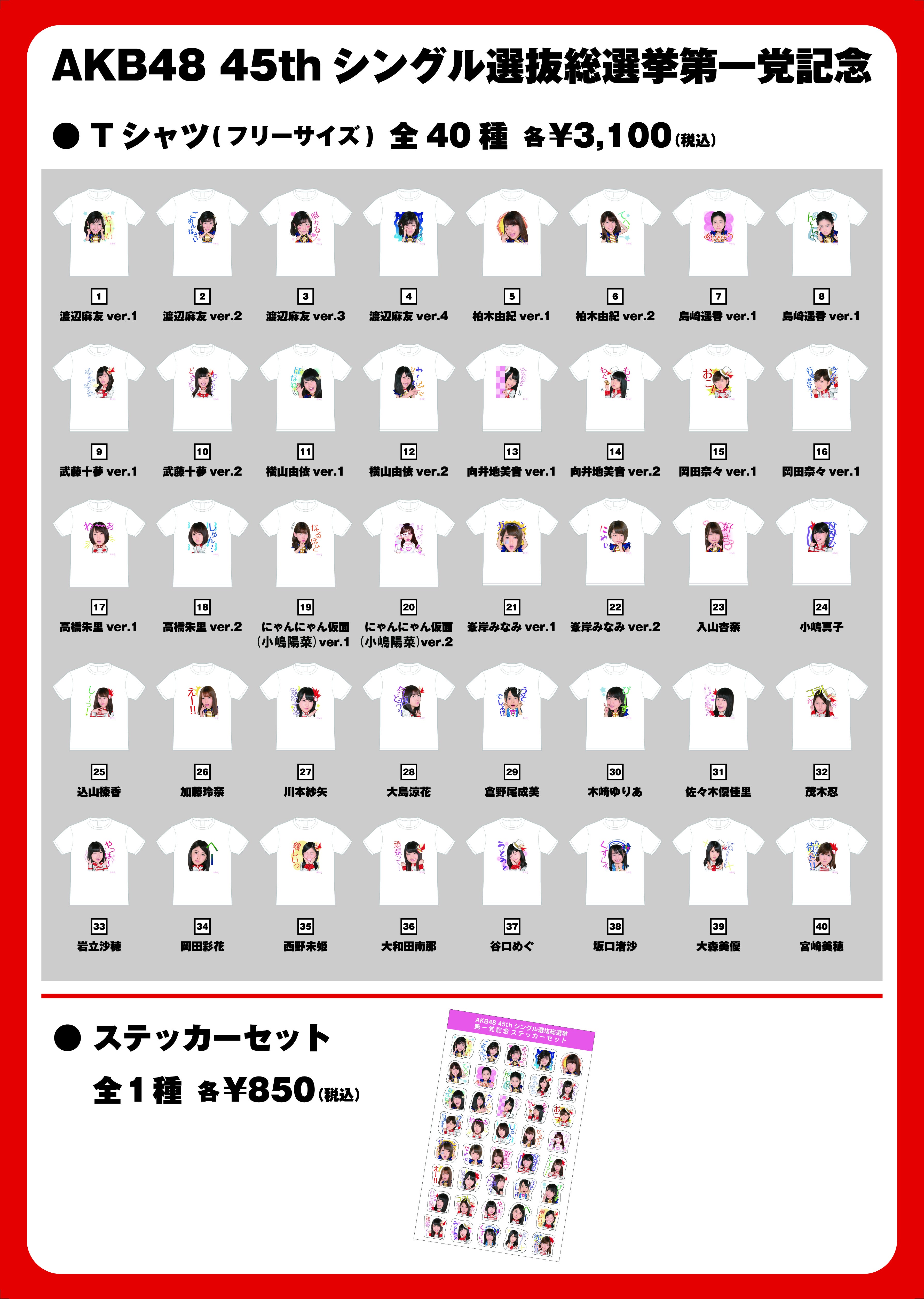 ・AKB48 45thシングル選抜総選挙 第一党記念 Tシャツ40種(フリーサイズ1種展開) 各3,100円