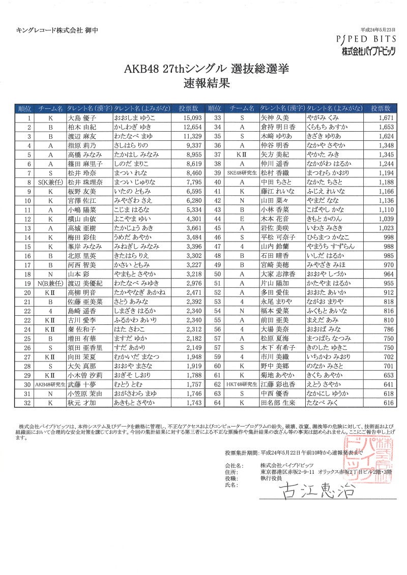 本日のAKB48劇場公演にて「27thシングル 選抜総選挙」の速報(1位~64位)を発表させていただきました。