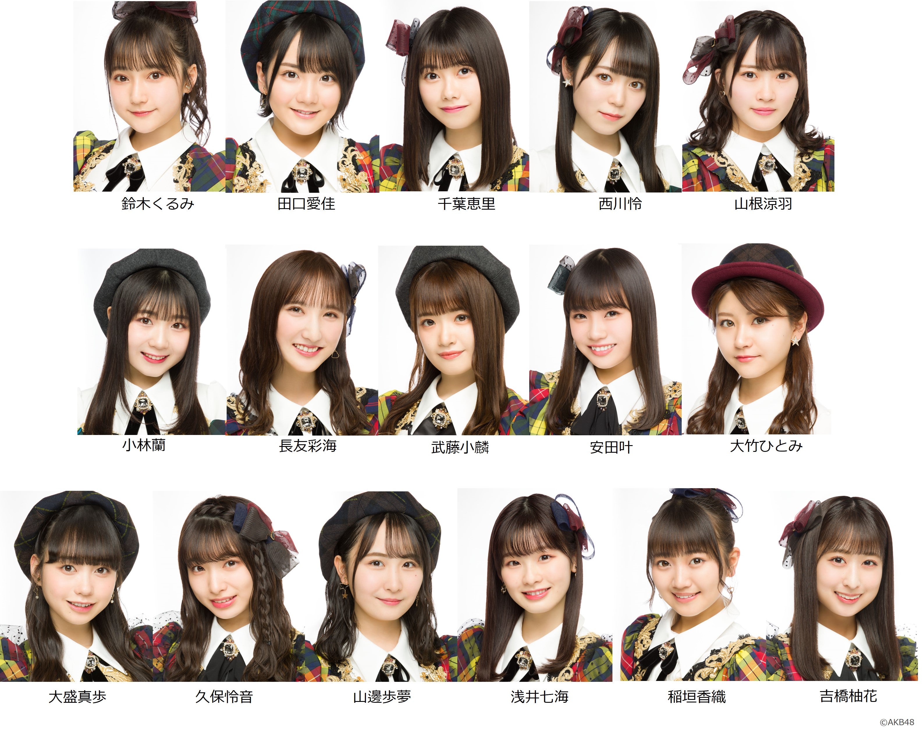鈴木くるみ、田口愛佳、千葉恵里、西川怜、山根涼羽、小林蘭、長友彩海、武藤小麟、安田 叶、大竹ひとみ、大盛真歩、久保怜音、山邊歩夢、浅井七海、稲垣香織、吉橋柚花