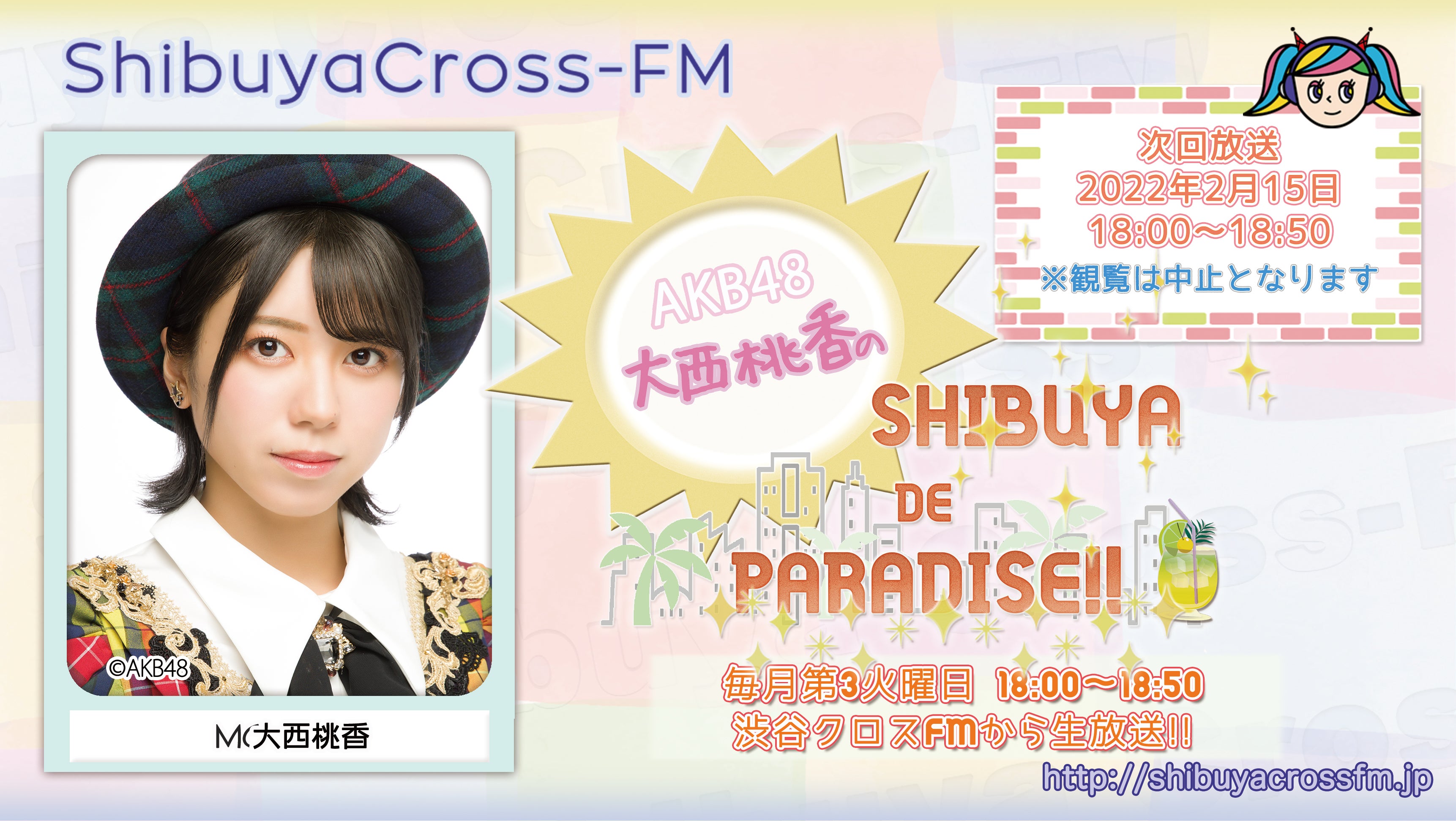 2月15日(火)18:00からの、AKB48チーム8 大西桃香の冠番組、渋谷クロスFM「AKB48 大西桃香のSHIBUYA DE PARADISE‼」は生放送でお届けします!