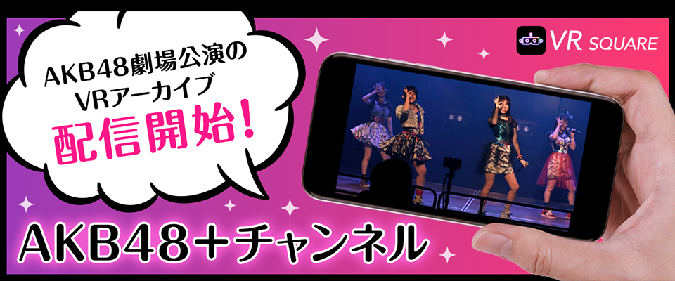 『AKB48+(PLUS)チャンネル』は、VRコンテンツ配信サービス「VR SQUARE」において、AKB48劇場公演のライブ配信と2020年8月以降のアーカイブ映像をVRでお楽しみいただけます。